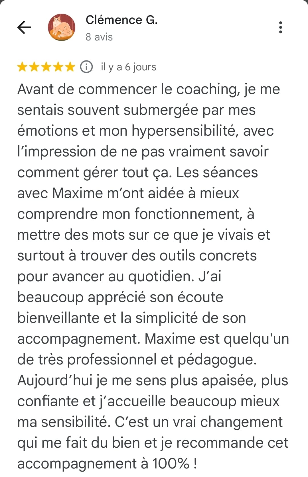 Je m’appelle Maxime, je suis coach de vie spécialisé dans l’accompagnement des personnes hypersensibles. Mon rôle est de vous aider à transformer cette intensité qui parfois vous épuise en un véritable atout dans votre vie personnelle et professionnelle.